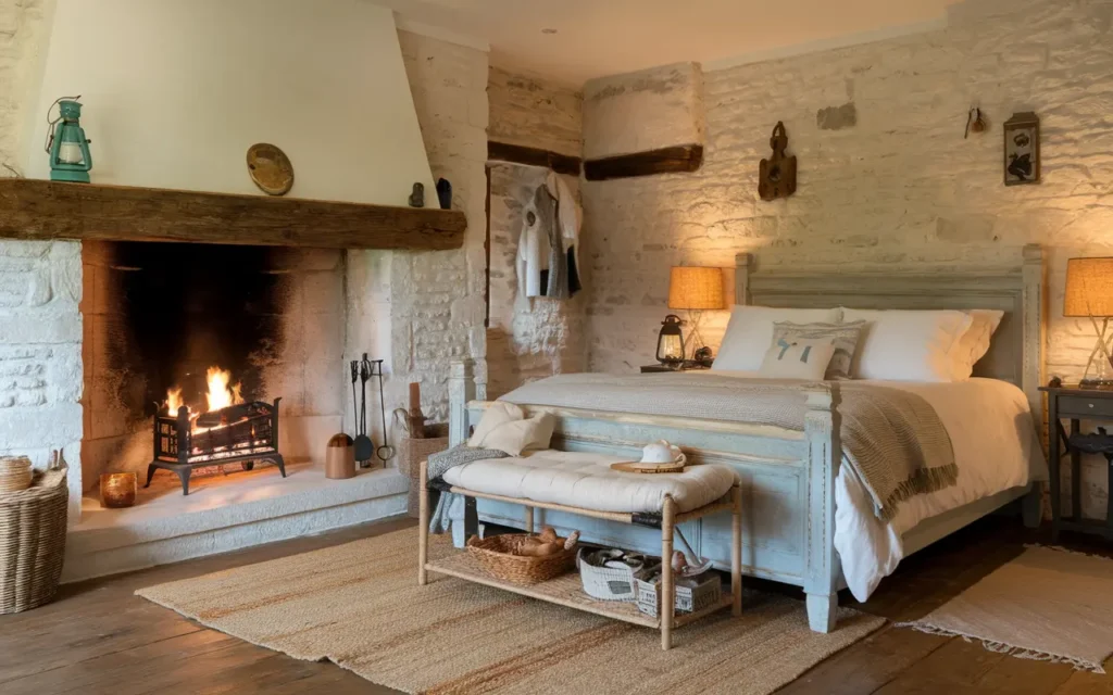 Bedrooms in countryside cottages are havens of calm. Sloping ceilings, iron bedsteads, and quilts in soft florals create an intimate retreat. Natural textures—linen curtains, wool blankets, wicker baskets—make the space feel grounded yet romantic.