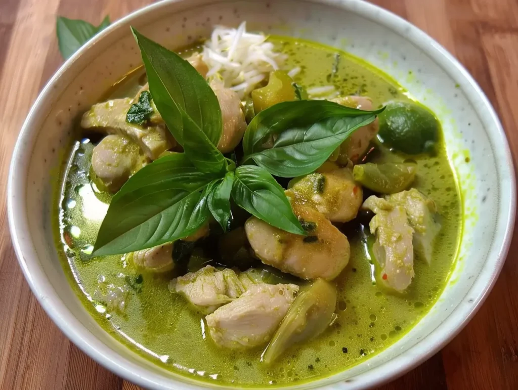 Emerald-green curry made of fresh green chilies, herbs, coconut milk, and usually chicken or fish, with eggplant and Thai basil dancing in the sauce.