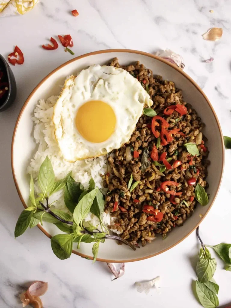 Ground meat (commonly pork or chicken), bird’s-eye chillies, garlic, fish sauce, and holy basil, flash-fried over searing heat and served over rice, sometimes crowned with a fried egg.